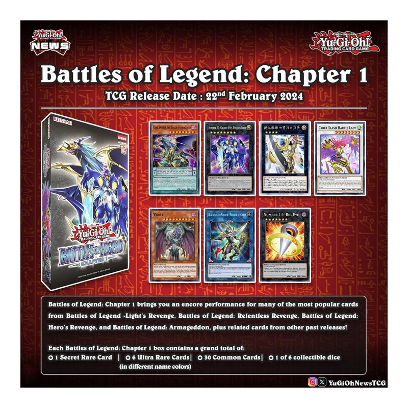 Battles of Legend: Capítulo 1 te ofrece una interpretación repetida de muchas de las cartas más populares de Battles of Legend: Light's Revenge, Battles of Legend: Relentless Revenge, Battles of Legend: Hero's Revenge y Battles of Legend: Armageddon, además de cartas relacionadas. de otros lanzamientos anteriores!
